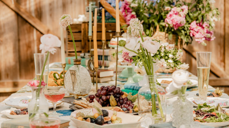 • Establish your vibe and run with it. With the desire to have a more vintage aesthetic, a collection of antique quilts were used as tablecloths. This made for the perfect foundation to add in other vintage plates, serving pieces, and accessories.