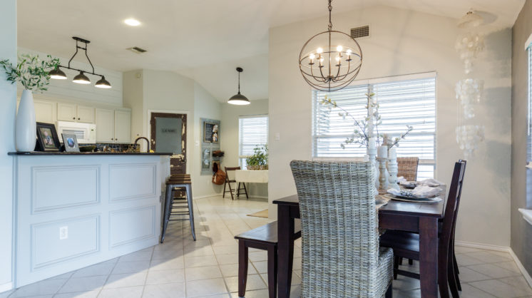The true character of the home shines through in the living room. The pale, neutral shades with weathered textures allow their décor to evoke the sea with the colors of nature. Elements such as the wooden pelican and heron statues purchased at the Rockport Art Festival add personality to the space. A large DIY wall display board, painted with salt wash for a beachy weathered look, showcases 3 oars collected by Matt, lending a nautical touch. Driftwood, Emily’s favorite decorating staple, can be seen spread creatively around the home – the most eye-catching display is in the form of large pieces drilled together to make a decorative fireplace cover. Other beach-inspired treasures such as faux coral, algae prints, shells, and glass buoys highlight the natural beauty of coastal décor.