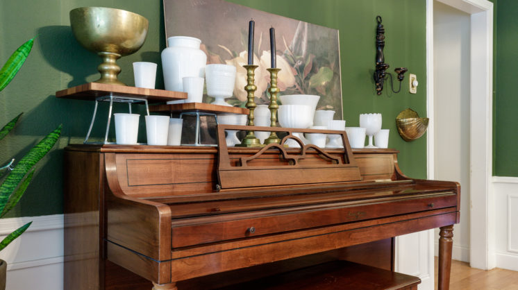 The dining area, which used to be a soft but overpowering shade of yellow, is now a bold shade of dark green, which pairs nicely with the wooden furniture and gold accents throughout the room. A wide assortment of milk glass jars sit atop a wooden piano, and when lit with candles, the light pops off the translucent jars, bouncing off the magnolia painting and highlighting the dark shade of the room.