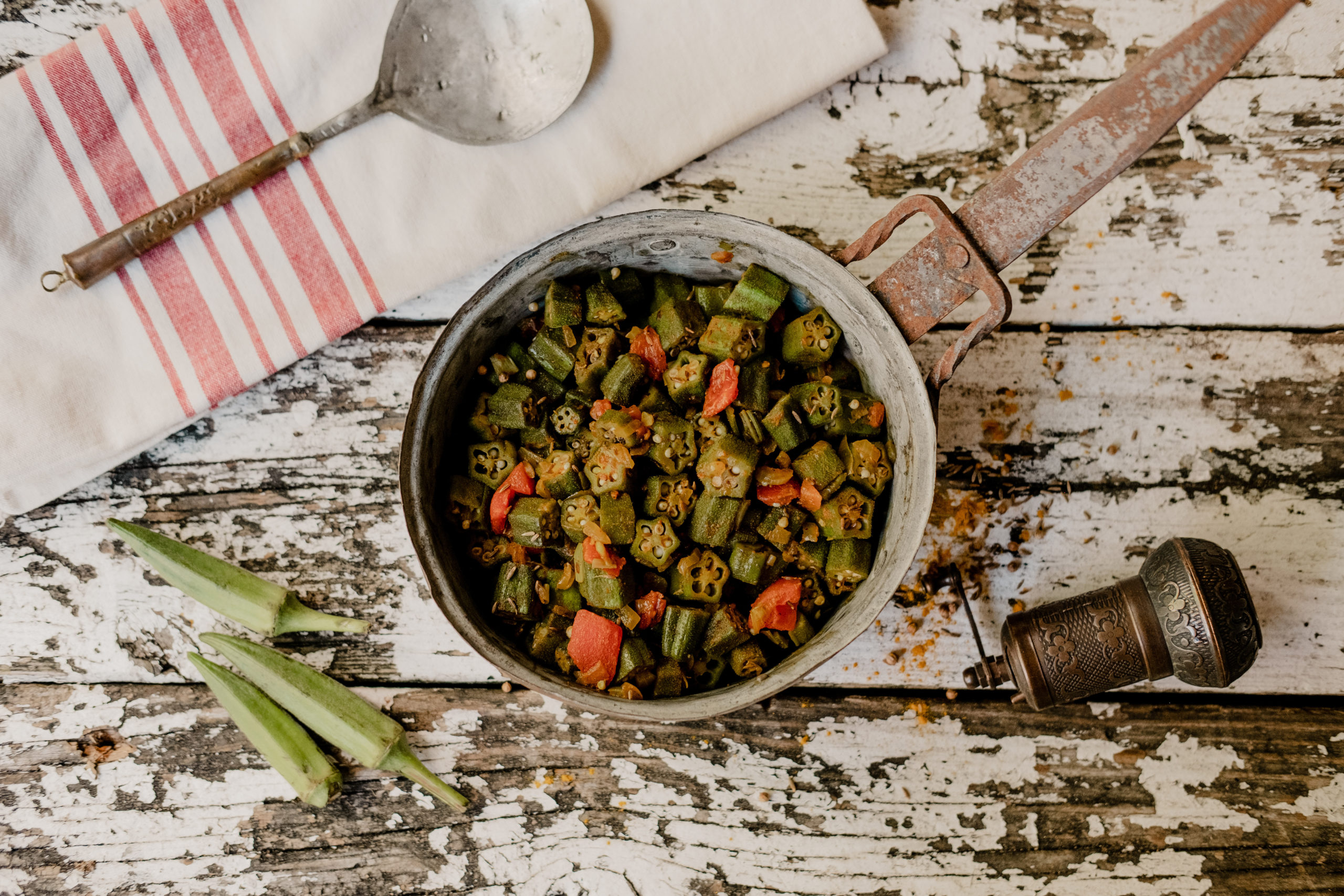 Okra is a seasonal favorite in late summer when little else can survive the heat. Stewed okra is a natural conduit for North Indian flavors, as in this Bhindi Masala. The grassy notes of fresh okra are complemented by bloomed coriander and cumin. Desiccating the okra prior to cooking helps quell any unwanted mucilage.