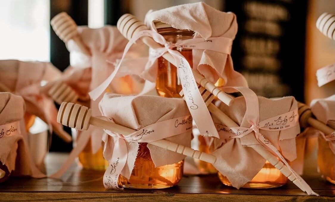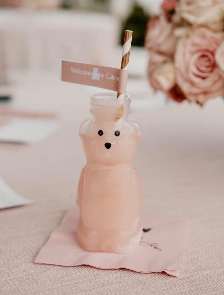 There were plenty of opportunities to incorporate bear-themed details into the shower. Instead of the typical cup, glass bottles in the shape of a bear were used for drinks. Honey jars and dippers were curated for favors to bring the theme full circle.