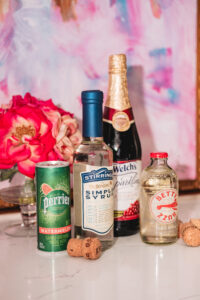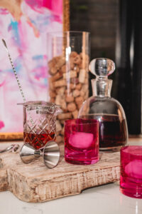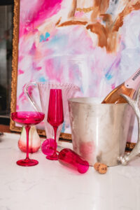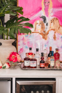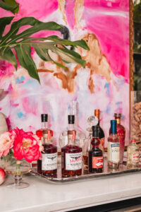 Bar at the home of Katie & John Reichert, Maple Bourbon by Aerodrome Distilling, Wild Rag Vodka by South Texas Distillery, Glassware & Champagne bucket from Park Seven and ‘Katie & Co.’ art by Franco Mondini-Ruiz.