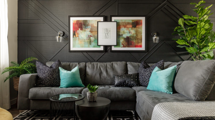 When choosing the wall art, Shaynaeh was looking for something that popped against the black wall, and found two abstract pieces of art featuring a combination of teal, orange, brown, burgundy, and black, which provided the necessary bursts of color. Overlapping both colorful prints is a smaller, simple design with black lines intertwined to resemble the silhouette of a woman. Layering is one of Shaynaeh’s favorite techniques, and the entire layout of the artwork over the linear wall blends in nicely with the black and white print, and the teal throw pillows on the gray sectional couch situated directly beneath the artwork. Shaynaeh put her own spin on a metal and glass coffee table design by combining a solid black metal table reminiscent of African drums used for dancing with a simpler, wired metal, glass top table overlapping it. These two designs form a unique style with the intended wow factor.